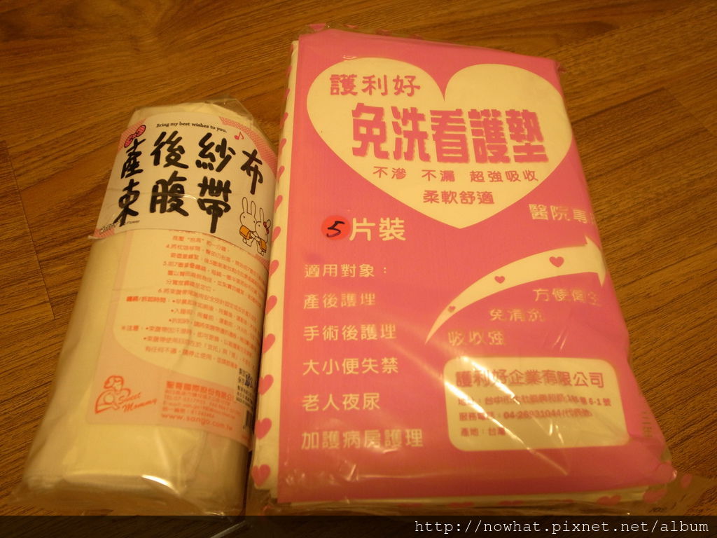*紗布衣(一件120), 兔裝(2套500), 看護墊(5片79元), 產後紗布束腹帶($350)