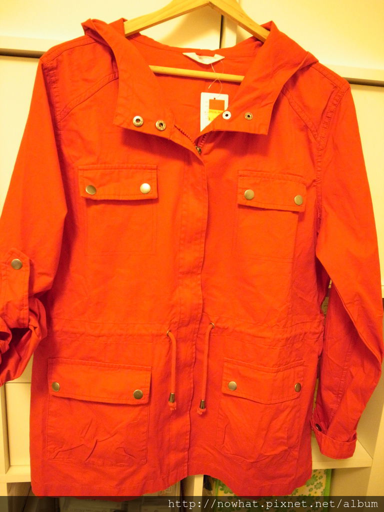 黃光下照起來變橘色 但實際是很漂亮的正紅 屬於單層較輕薄的外套